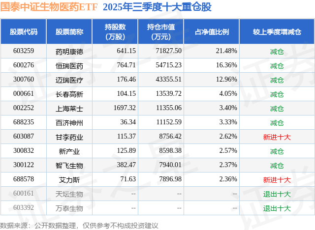 从基金限度来看,国泰中证生物医药ETF基金2025年三季度公布的基金限度为33.44亿元,较上一期限度35.26亿元变化了-1.82亿元,环比变化了-5.15%。该基金最新一期财富竖立为:股票占净值比99.63%,无债券类财富,现款占净值比0.4%。从基金握仓来看,该基金当季前十大股票仓位达71.5%,第一大重仓股为药明康德(603259),握仓占比为21.48%。